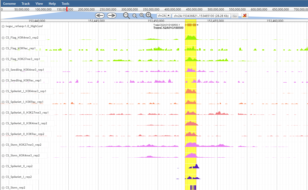 For gene query function, wheatRegNet provides REs which associate with the gene, and RE's position at the chromosome、histone modification、RE type(active、repress、poised)、Hi-C contaction, correlaction, P_value, regulatory score, pi and motif information. wheatRegNet can also provide the specific distribution of these REs in different tissues. For genomic region query function, wheatRegNet will analyze which REs are contained in the genomic region and which genes are regulated by these REs, and which motifs these REs contain.